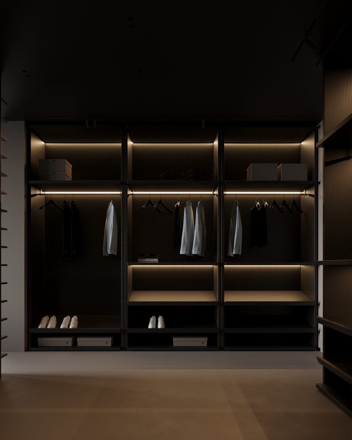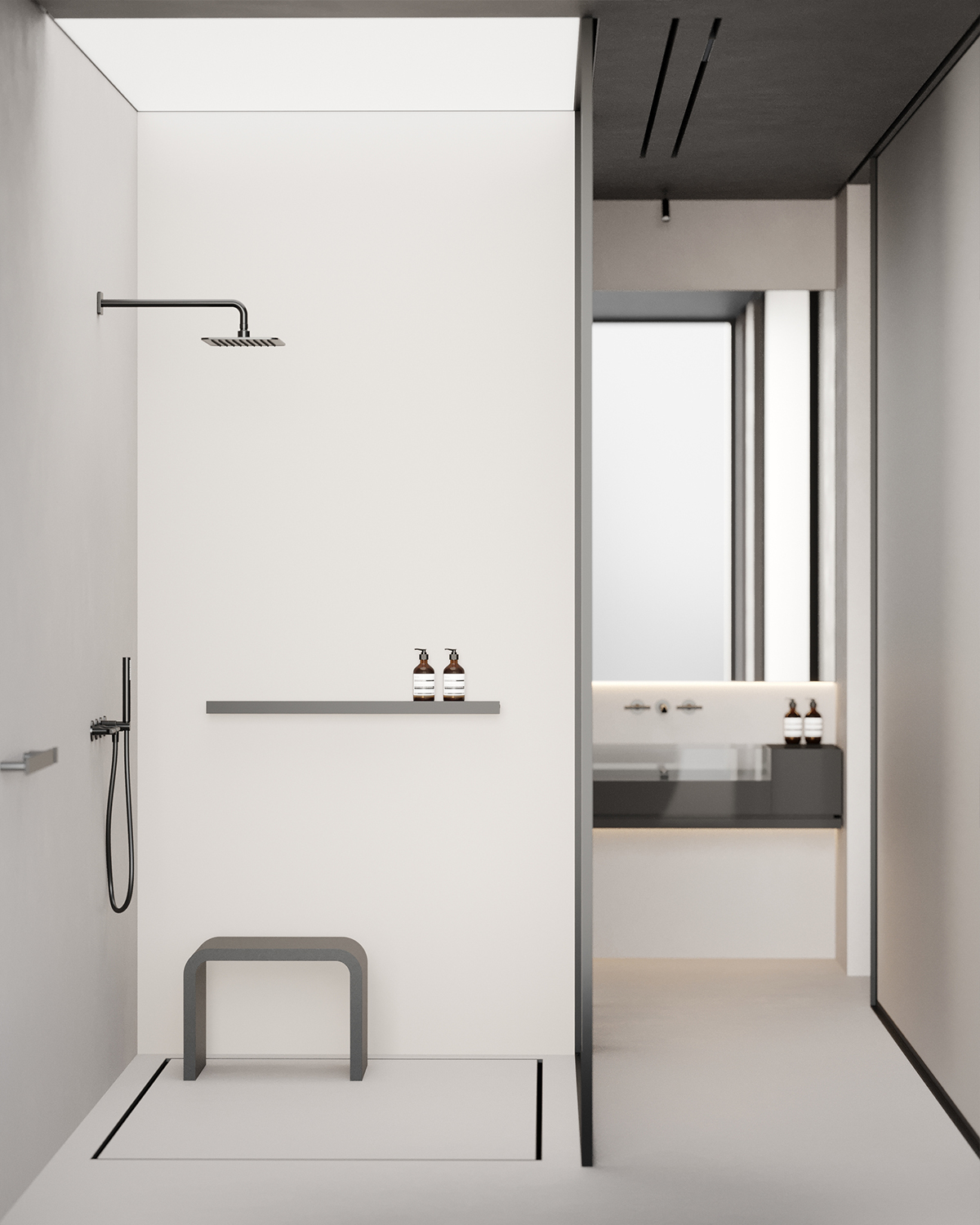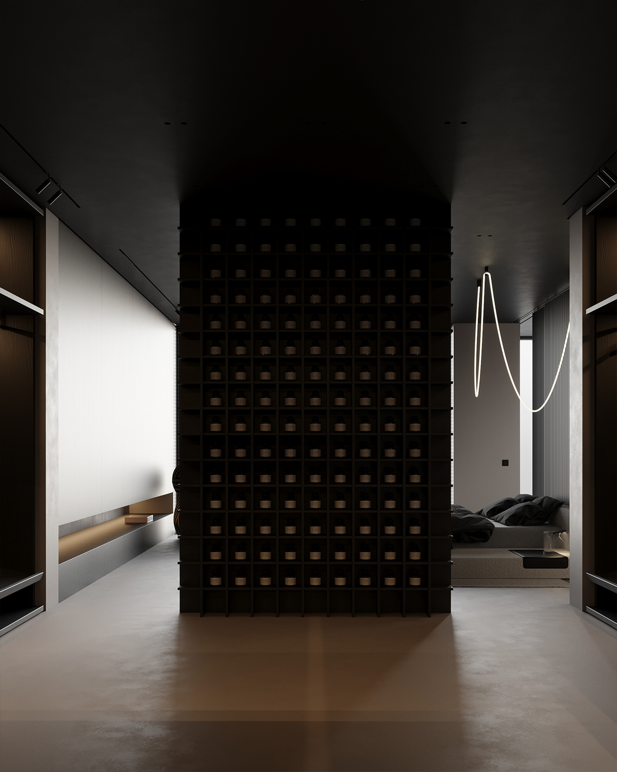 Chiar lângă dormitor, există o zonă de dressing și baie open space. Ne-am concentrat pe îmbinarea stilului cu funcționalitatea, soluțiile inteligente de depozitare menținând totul ordonat, subliniind simplitatea. Baia, cu finisaje excepționale din microciment, obiecte sanitare minimaliste și produse de înaltă calitate alese special pentru acest spațiu, oferă o atmosferă de spa pe fundalul orașului.