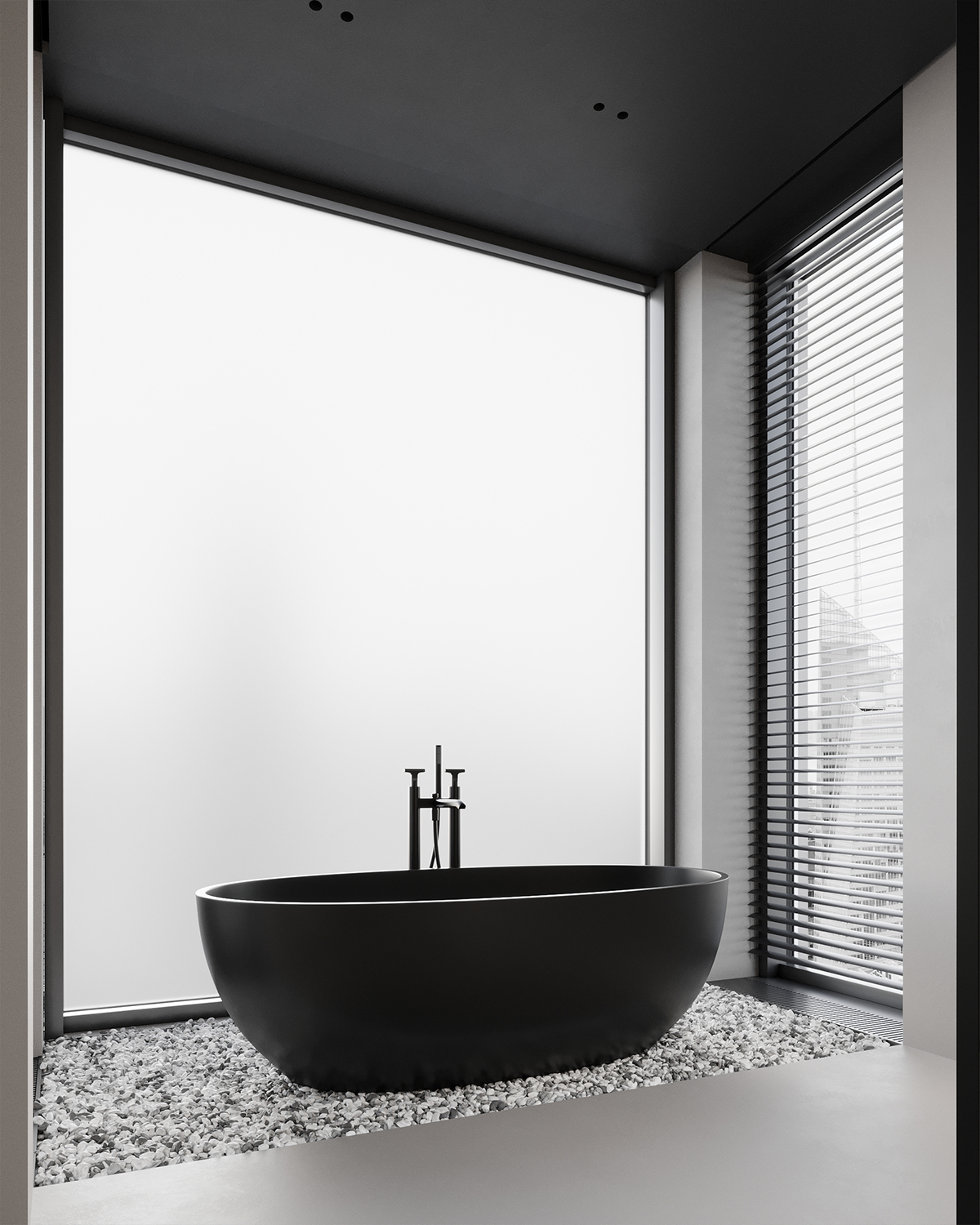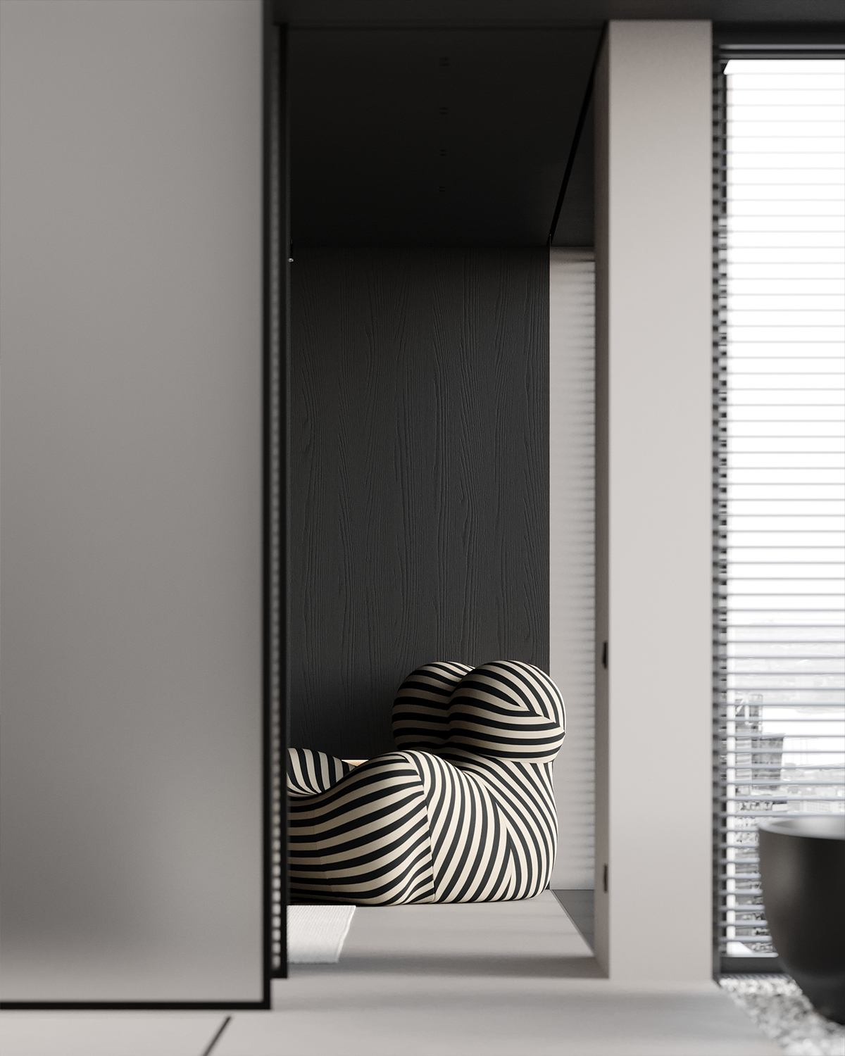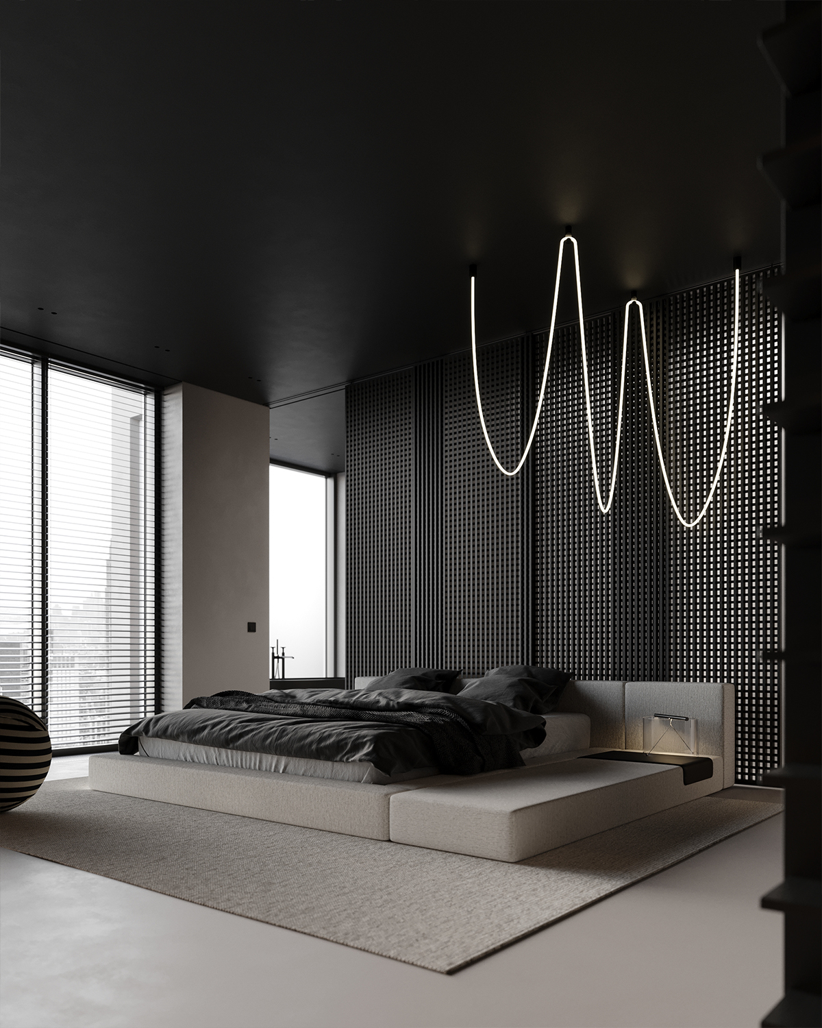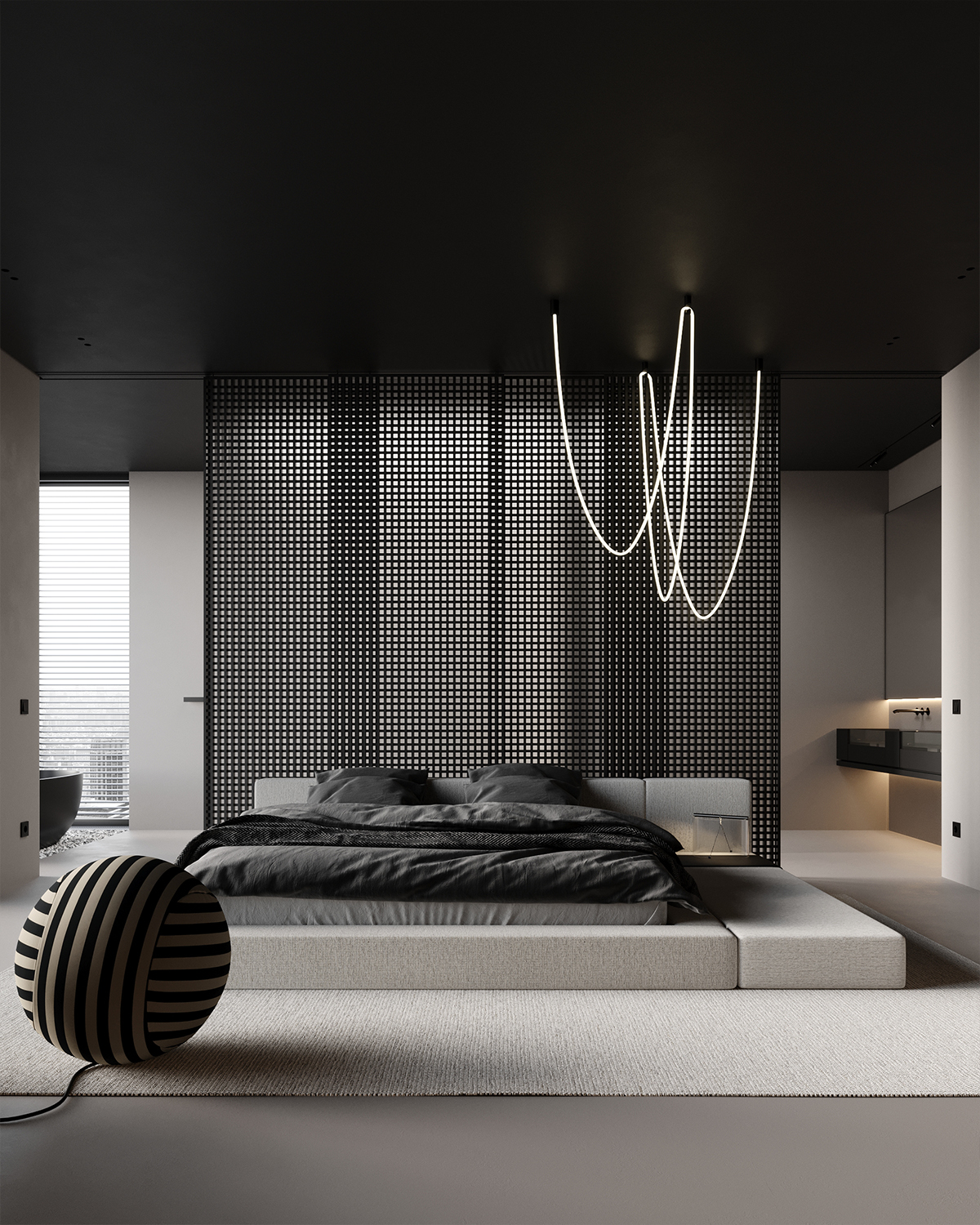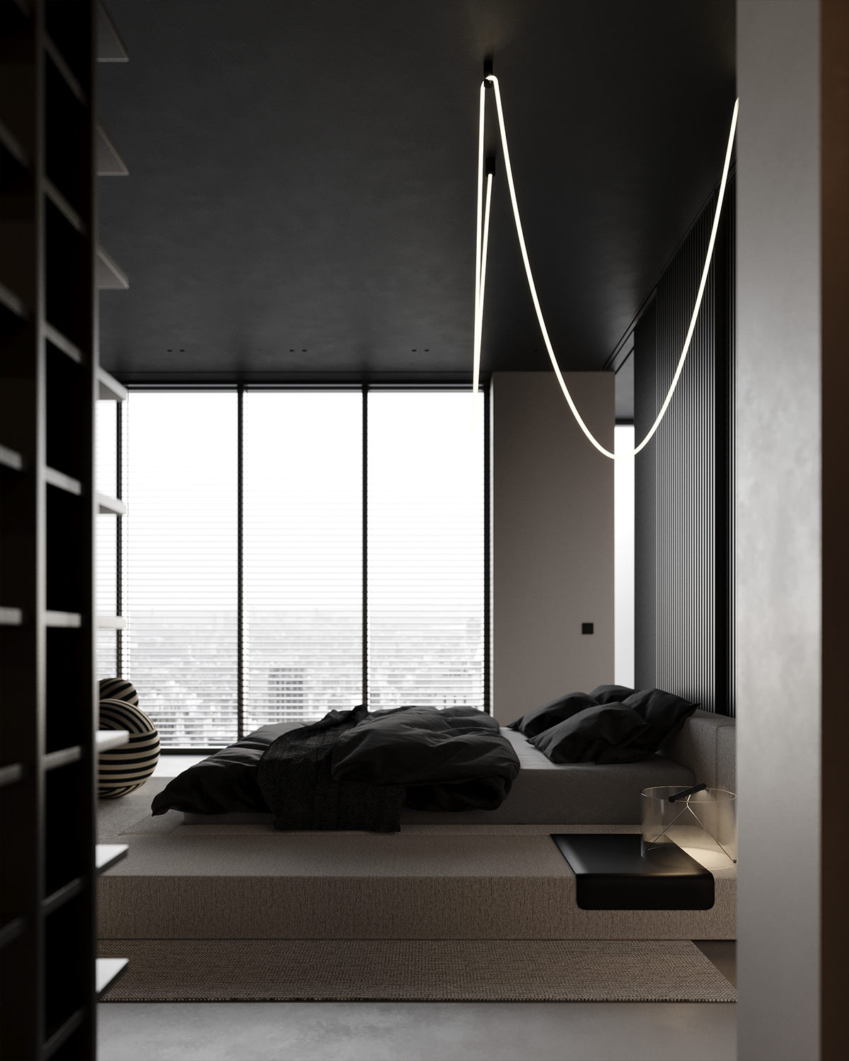 Drawing inspiration from the city’s energy, we created a space that is both modern and elegant, using simple black and white tones. We employed clean lines and minimalist furniture, making the room feel very airy and open. The large windows provide plenty of natural light indoors and offer an extraordinary view of the city.