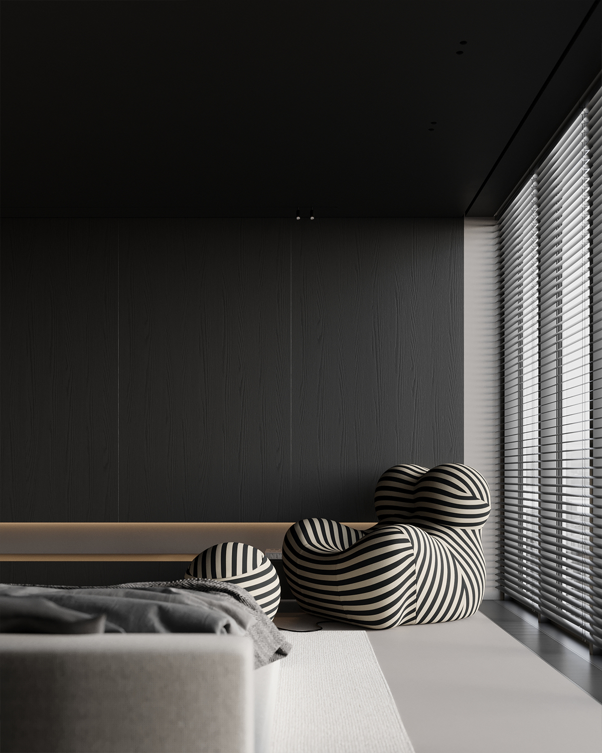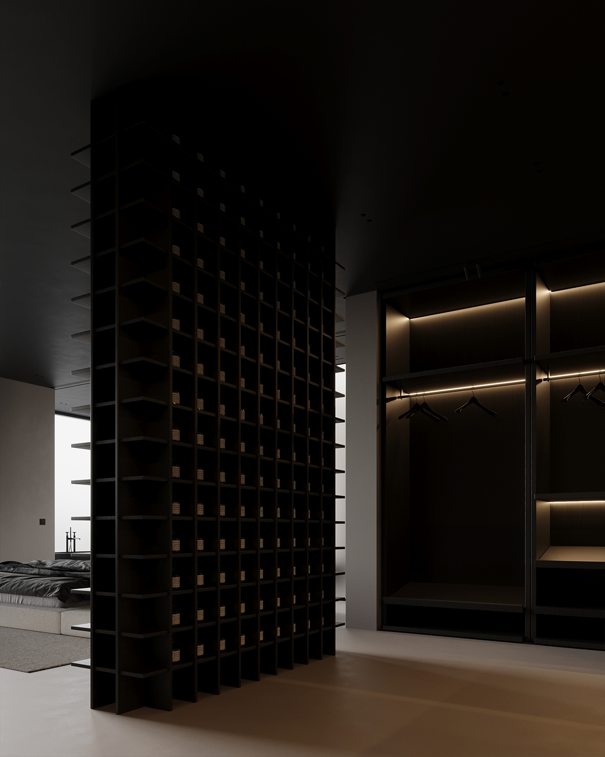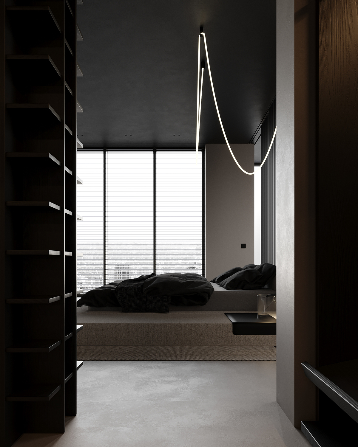 We present our project done in New York. It’s about an open space bedroom, very modern and minimalist, with an extraordinary and iconic view over New York City. Microcement floor, sleek dark wood, and ceiling create elegance. The black minimalist bedroom design embraces simplicity while maintaining a luxurious feel. Large windows bring in natural light, enhancing the contrast between dark tones and bright open spaces, creating a sophisticated urban retreat.